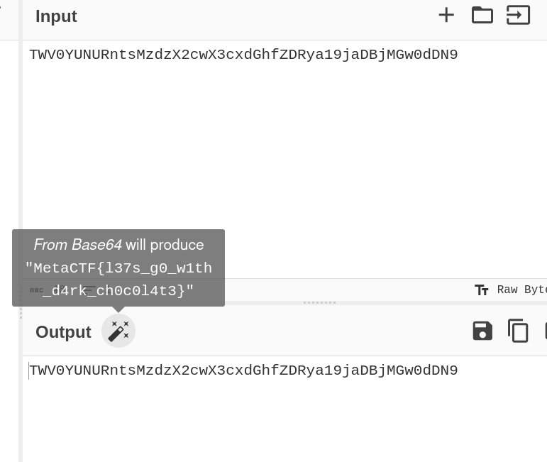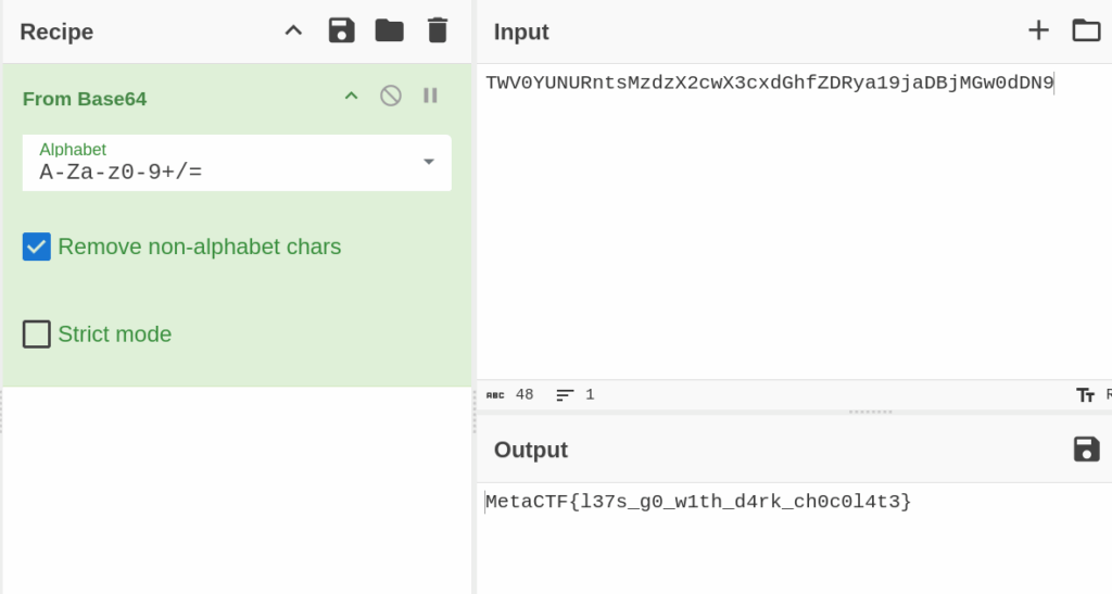 Pressing this will insert a From Base64 block into the recipe, which will decode the input text and yield the flag.