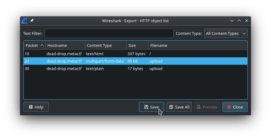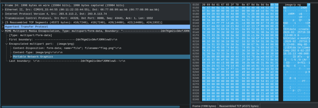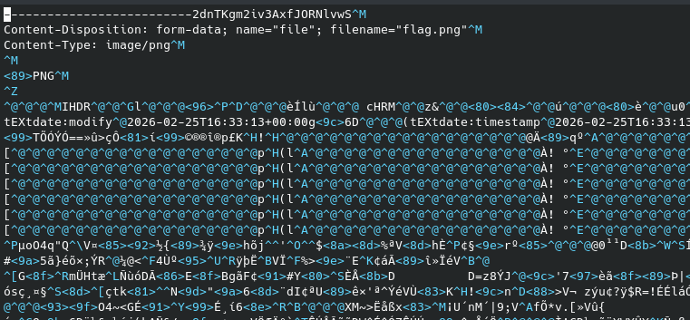 We see some form-data with the filename flag.png. Presumably, this is our flag. We’ll need to extract it. There are a few methods of approaching this.