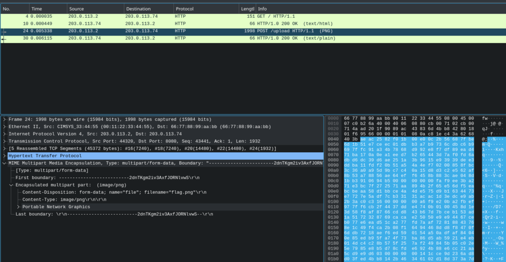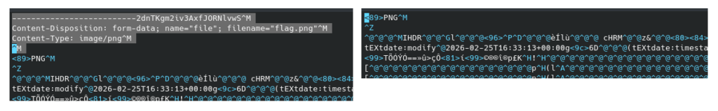 We can save the multipart/form-data as a PNG file, but it won’t open. Why? If we open it in a hex or text editor, we’ll see that it’s because the form data delimiters are still present: