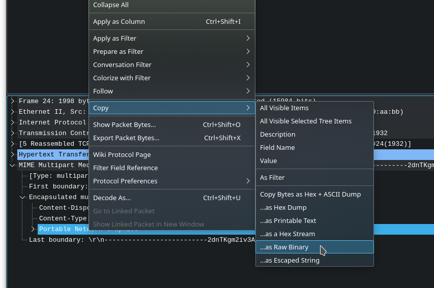 The other options in this menu (as hex dump, as escaped string, etc.) are also quite useful for more complicated scenarios, where you need to do further processing on the data.