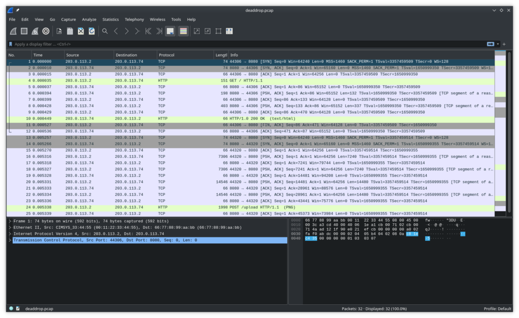 As with most packet capture challenges, let’s start by opening it in Wireshark, a free program for creating and analyzing network packet captures.