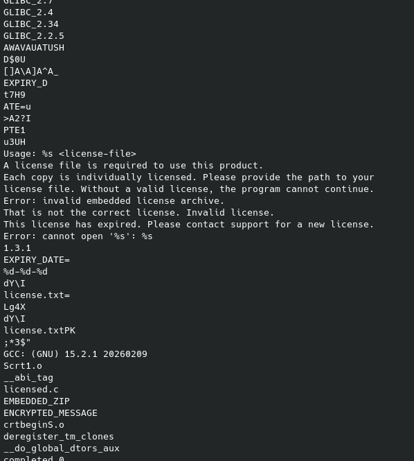 We can use file to determine that it’s a Linux executable (ELF), so if you don’t have a Linux host or VM, you’ll want to grab one. Use chmod +x license_to_rev to make it executable, then ./license_to_rev to run it (for safety, it’s best to do this in a container or VM with untrusted binaries).