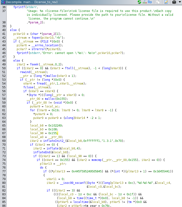 Interestingly, after some conditionals (probably reading in the license file), it’s calling functions like inflateInit2() and inflate(). A quick search hints these are zlib functions, and ldd confirms that the zlib library is used: