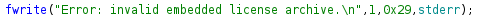 It doesn’t look like a very complex program – the output isn’t much longer than this. It looks like it expects a license.txt file at some point. Interestingly, there’s a mention of EMBEDDED_ZIP and ENCRYPTED_MESSAGE, but not much more. (The eagle-eyed might spot that sneaky PK near the middle…)